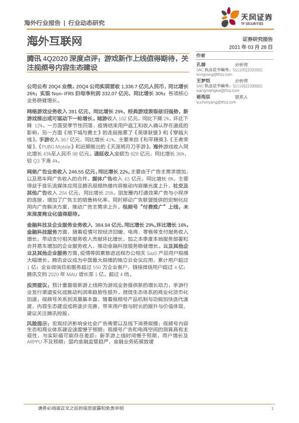 【天风证券】【20210328】腾讯4Q2020深度点评:游戏新作上线值得期待,关注视频号内容生态建设-8页