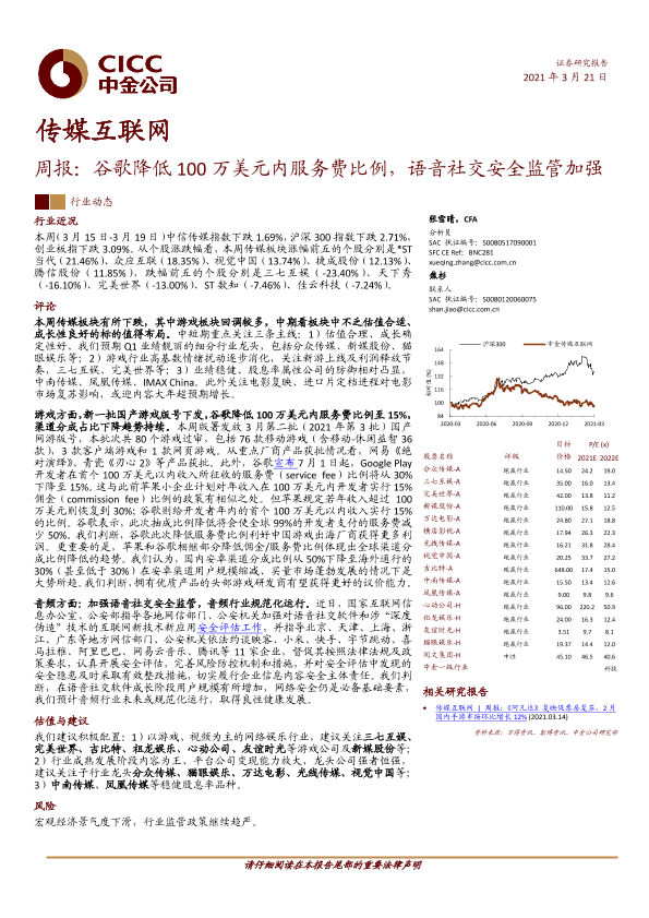 【中金公司】【20210321】传媒互联网周报:谷歌降低100万美元内服务费比例,语音社交安全监管加强-21页