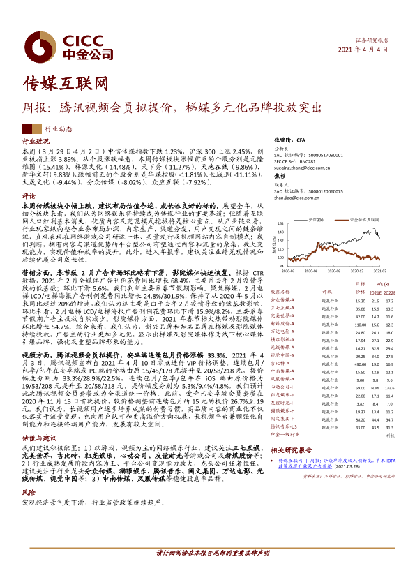 【中金公司】【20210404】传媒互联网周报:腾讯视频会员拟提价,梯媒多元化品牌投放突出-22页