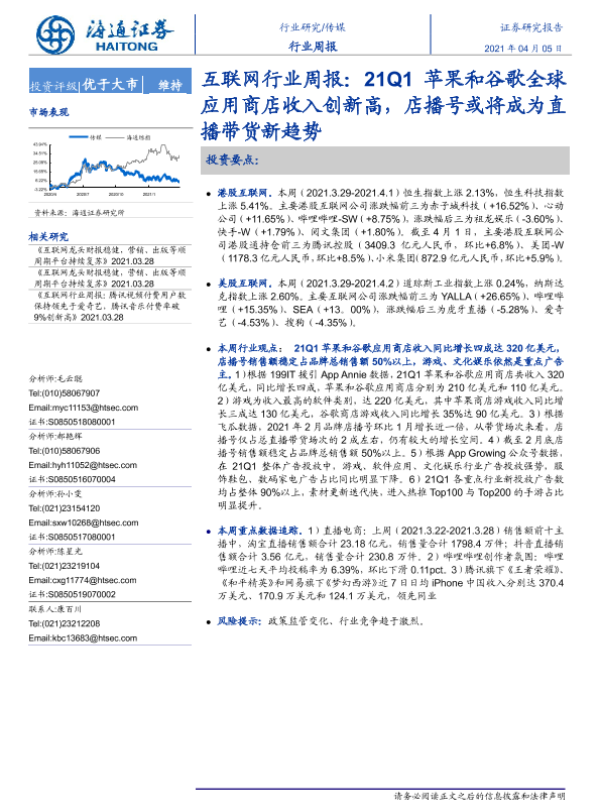 【海通证券】【20210405】20210405-海通证券-互联网行业周报:21Q1苹果和谷歌全球应用商店收入创新高,店播号或将成为直播带货新趋势-9页