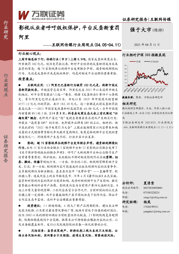 【万联证券】【20210411】互联网传媒行业周观点:影视从业者呼吁版权保护,平台反垄断重罚阿里-20页