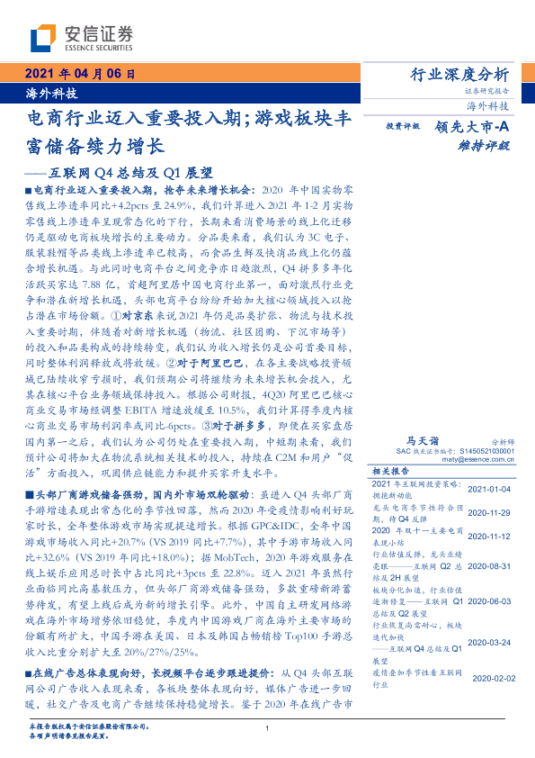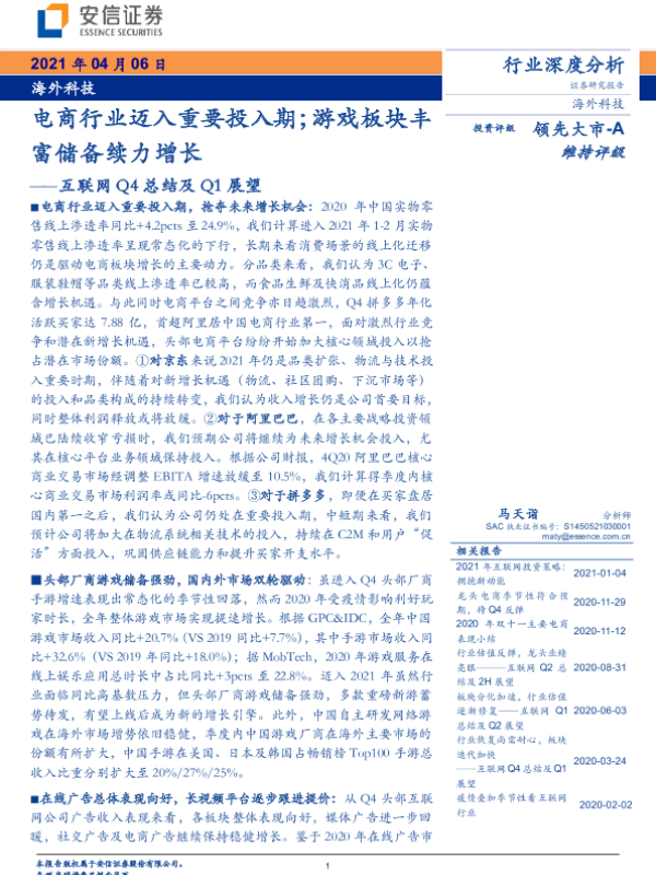 【安信证券】【20210406】互联网Q4总结及Q1展望:电商行业迈入重要投入期;游戏板块丰富储备续力增长-29页
