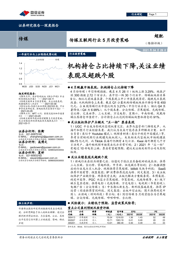 【国信证券】【20210429】传媒互联网行业5月投资策略:机构持仓占比持续下降,关注业绩表现及超跌个股-12页
