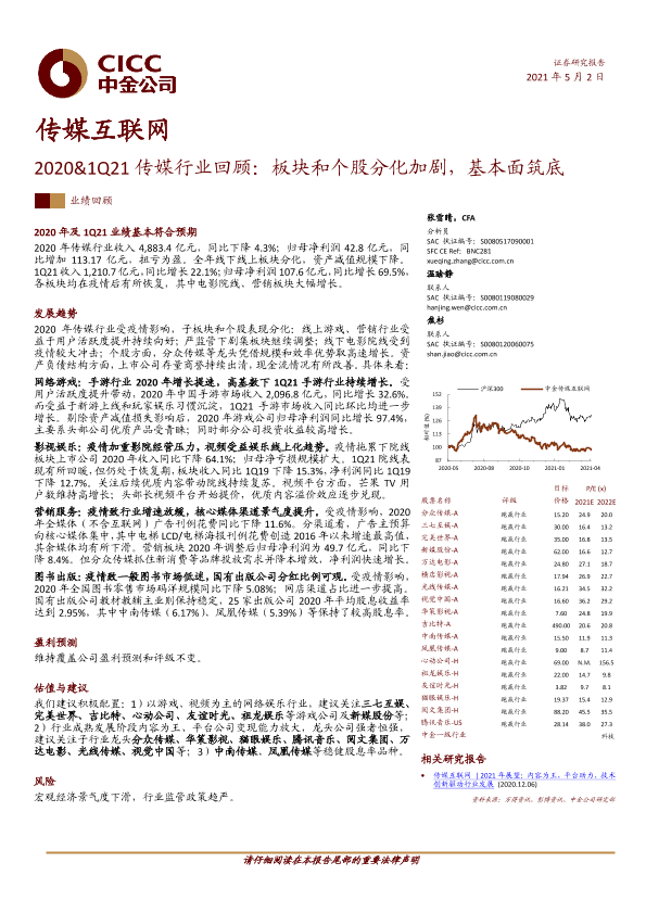 【中金公司】【20210502】传媒互联网2020&1Q21传媒行业回顾:板块和个股分化加剧,基本面筑底-32页