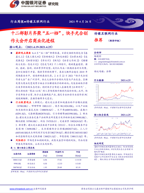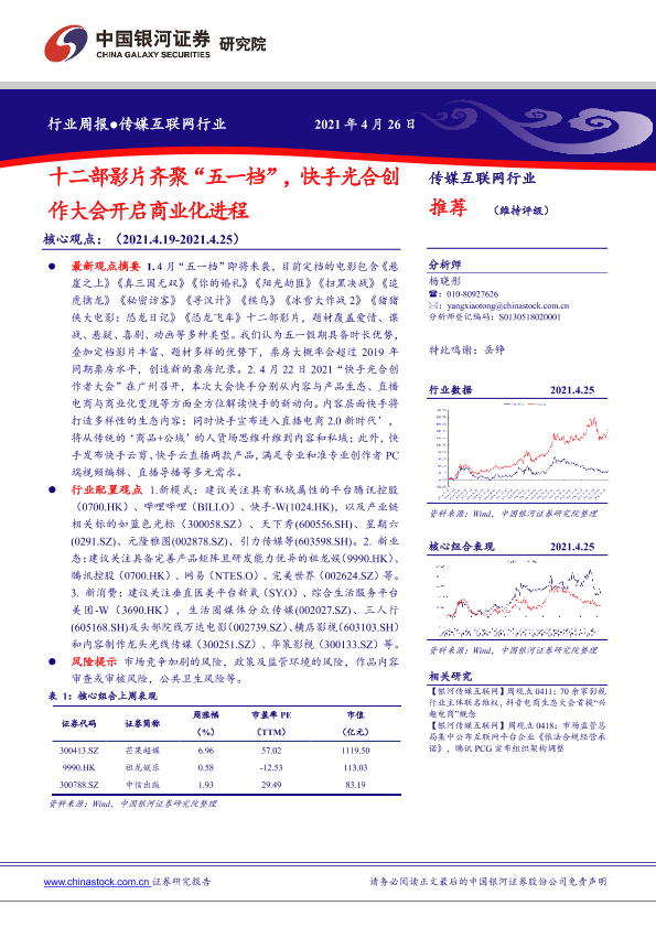 【银河证券】【20210426】20210426-中国银河-传媒互联网行业周报:十二部影片齐聚“五一档”,快手光合创作大会开启商业化进程-34页