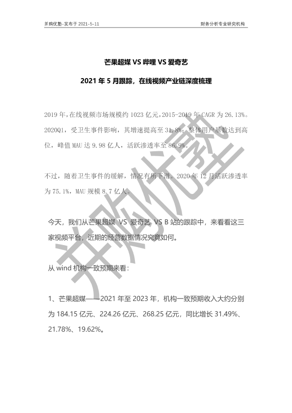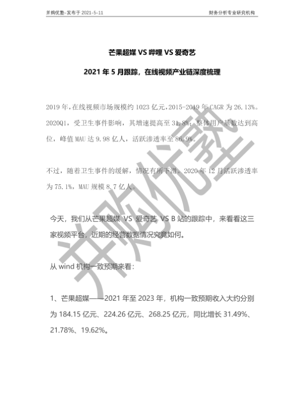 【并购优塾】【20210511】芒果超媒VS哔哩VS爱奇艺:2021年5月跟踪,在线视频产业链深度梳理-19页