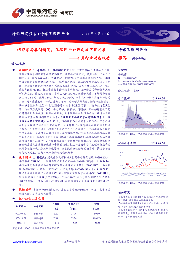 【银河证券】【20210510】传媒互联网行业4月行业动态报告:档期票房屡创新高,互联网平台迈向规范化发展-19页