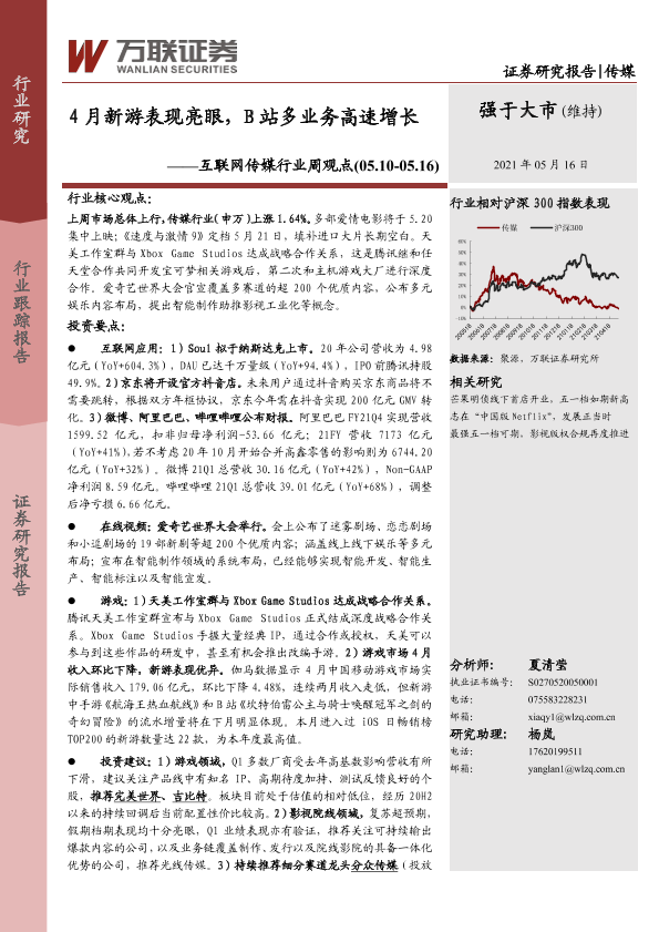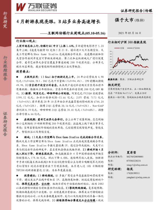【万联证券】【20210516】4月新游表现亮眼,B站多业务高速增长-21页