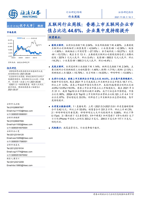 【海通证券】【20210516】20210516-海通证券-互联网行业周报:香港上市互联网企业市值占比达44.6%,企业集中度持续提升-8页