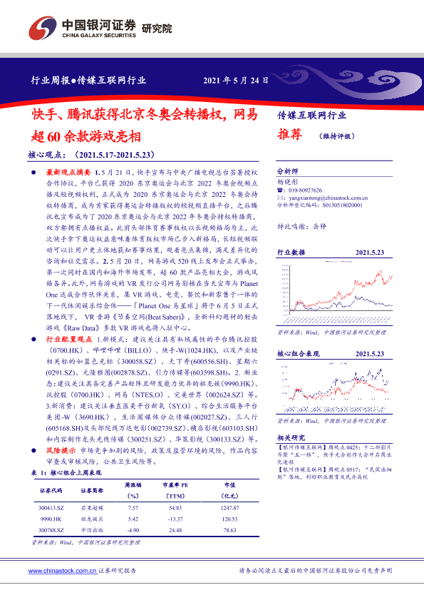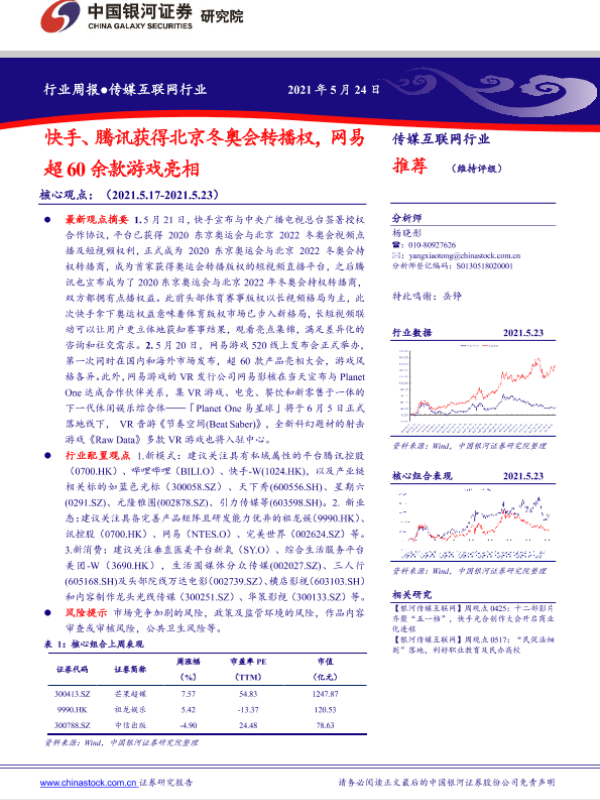 【银河证券】【20210524】20210524-中国银河-传媒互联网行业周报:快手、腾讯获得北京冬奥会转播权,网易超60余款游戏亮相-33页