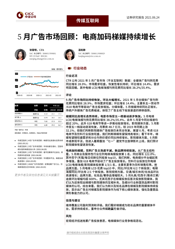 【中金公司】【20210624】5月广告市场回顾 电商加码梯媒持续增长-7页