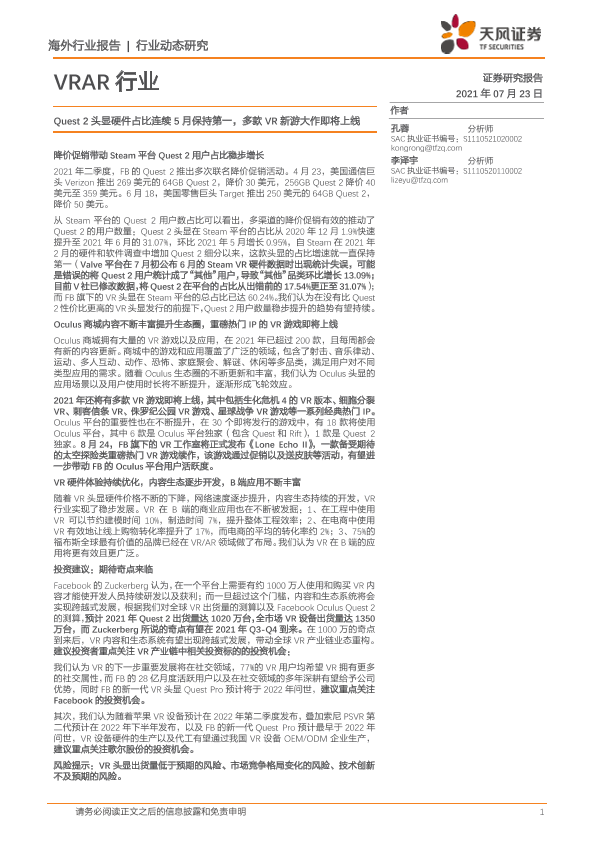 【天风证券】【20210723】VRAR行业:Quest2头显硬件占比连续5月保持第一,多款VR新游大作即将上线-4页