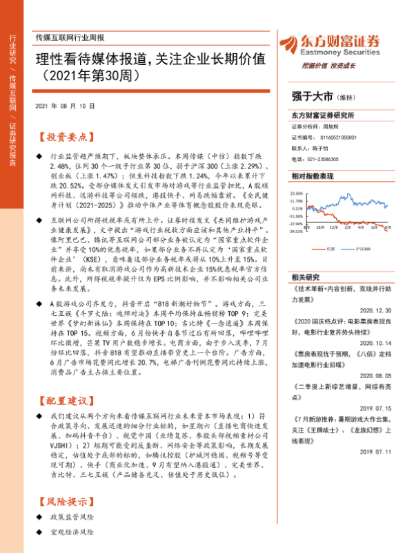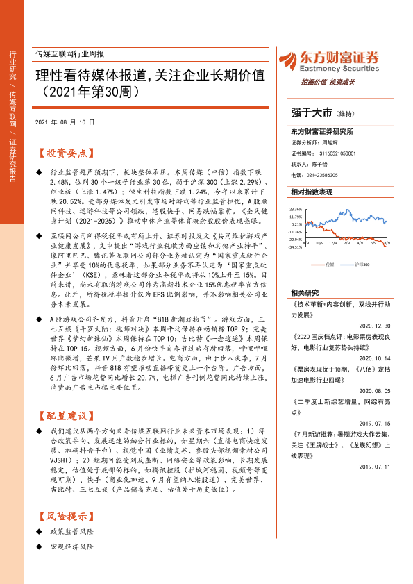 【东方财富证券】【20210810】20210810-东方财富证券-传媒互联网行业周报:理性看待媒体报道,关注企业长期价值-12页