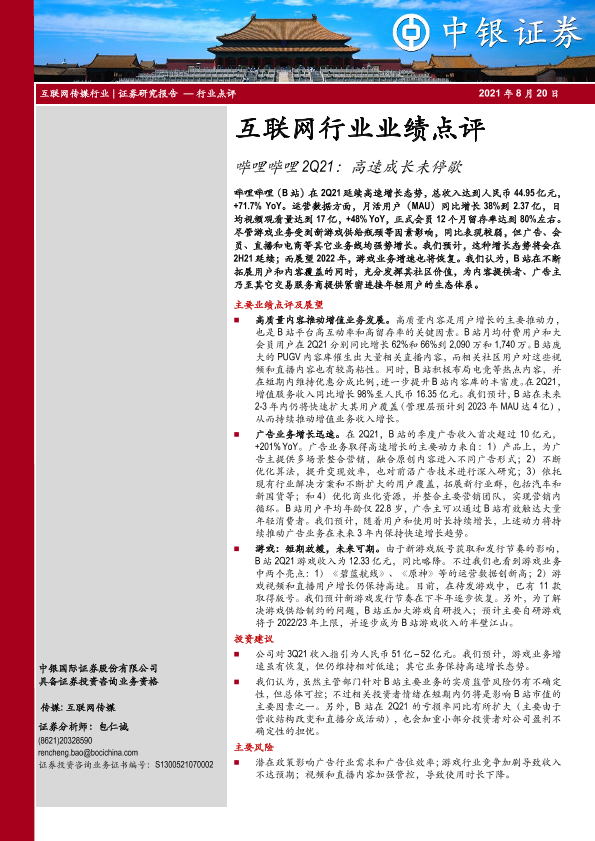 【中银证券】【20210820】互联网行业业绩点评:哔哩哔哩2Q21:高速成长未停歇-3页
