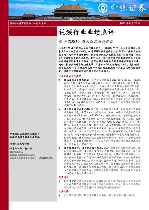 【中银证券】【20210826】视频行业业绩点评:快手2Q21:收入结构持续优化-3页
