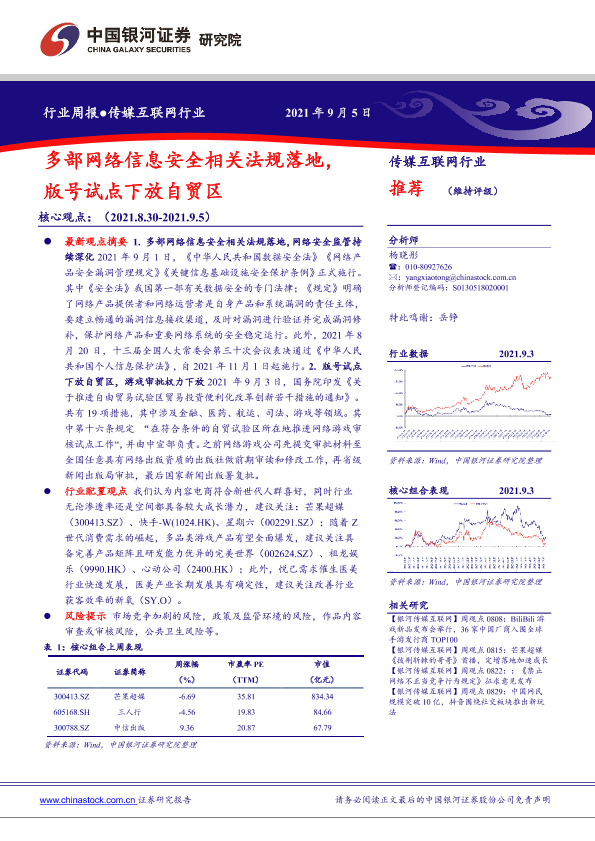 【银河证券】【20210905】20210905-中国银河-传媒互联网行业周报:多部网络信息安全相关法规落地,版号试点下放自贸区-36页