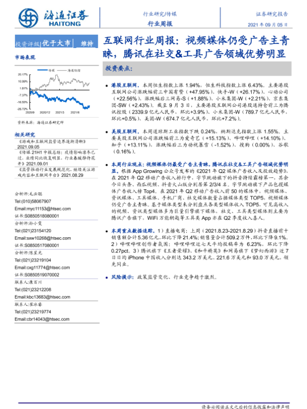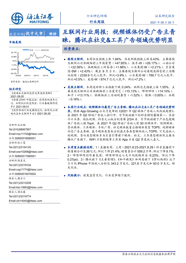 【海通证券】【20210905】20210905-海通证券-互联网行业周报:视频媒体仍受广告主青睐,腾讯在社交&工具广告领域优势明显-8页