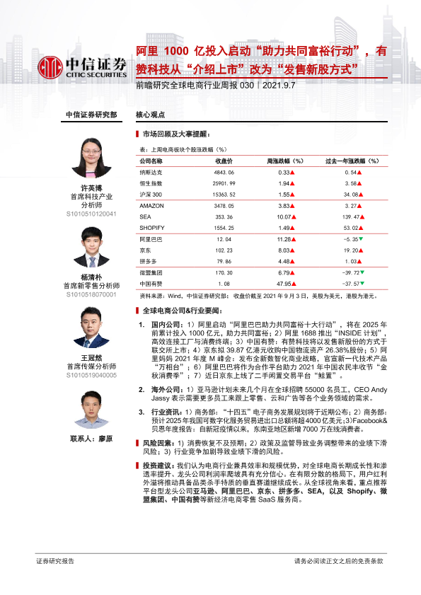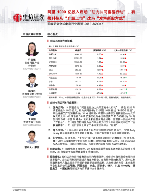 【中信证券】【20210907】前瞻研究全球电商行业周报:阿里1000亿投入启动“助力共同富裕行动”,有赞科技从“介绍上市”改为“发售新股方式”-20页