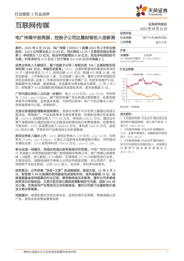 【天风证券】【20210831】互联网传媒:电广传媒中报亮眼,控股子公司达晨财智收入创新高-7页