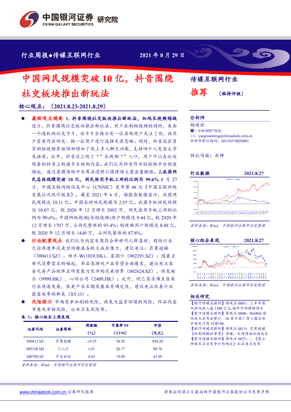 【银河证券】【20210829】中国银河-传媒互联网行业行业周报:中国网民规模突破10亿,抖音围绕行社交板块推出新玩法-36页