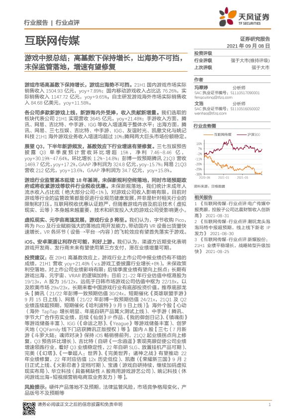 【天风证券】【20210908】互联网传媒:游戏中报总结:高基数下保持增长,出海势不可挡,未保监管落地,增速有望修复-32页