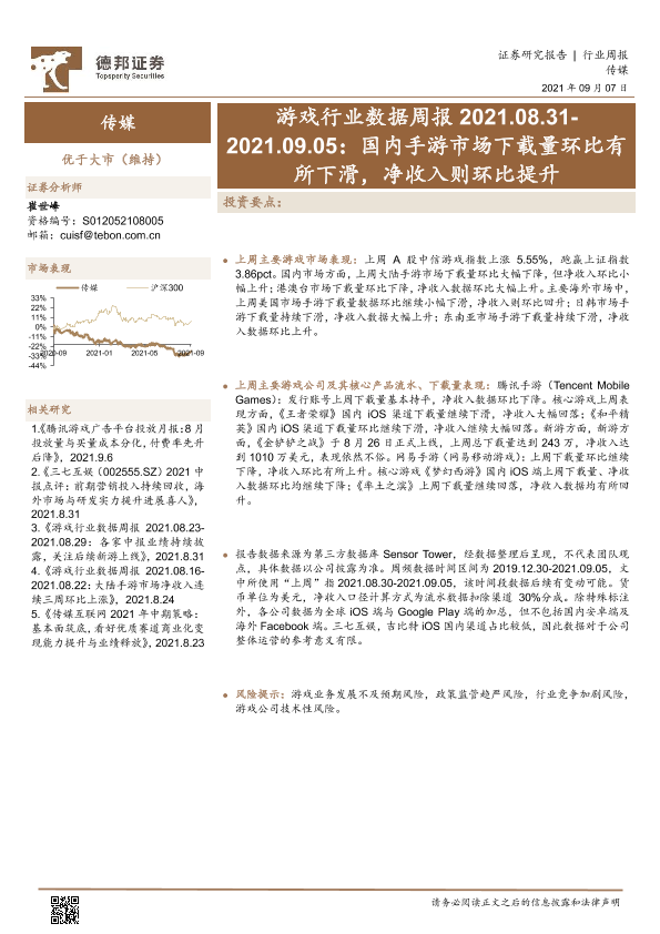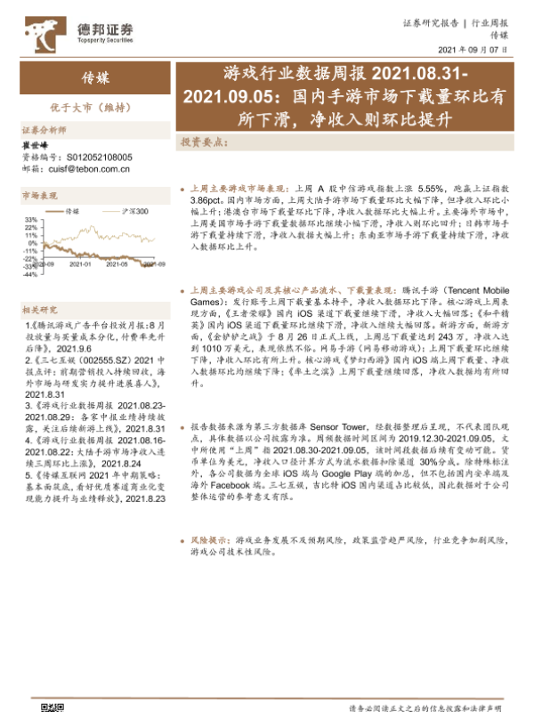 【德邦证券】【20210907】20210907-德邦证券-游戏行业数据周报:国内手游市场下载量环比有所下滑,净收入则环比提升-32页