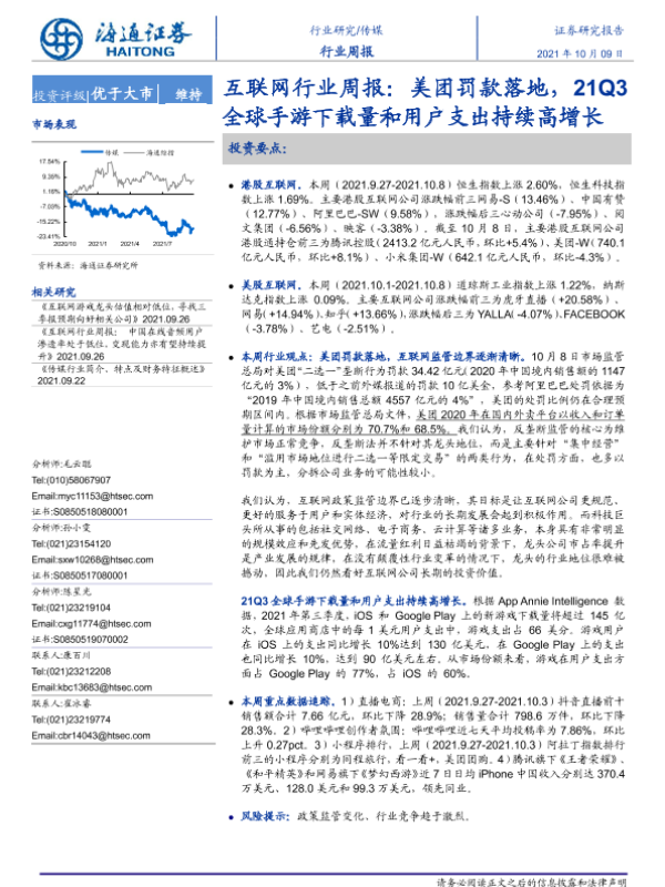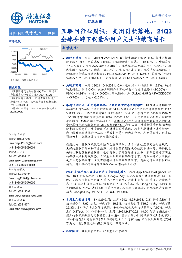 【海通证券】【20211009】20211009-海通证券-互联网行业周报:美团罚款落地,21Q3全球手游下载量和用户支出持续高增长-9页