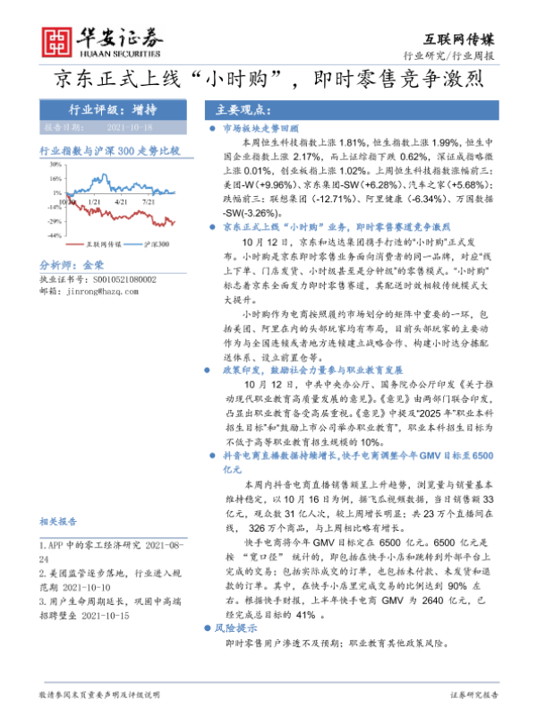 【华安证券】【20211018】20211018-华安证券-互联网传媒行业周报:京东正式上线“小时购”,即时零售竞争激烈-12页