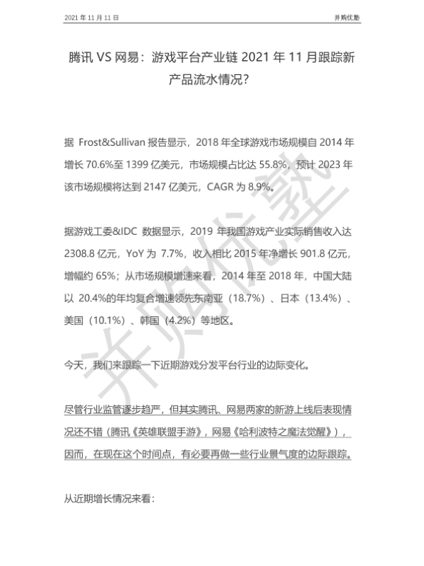 【并购优塾】【20211111】腾讯VS网易:游戏平台产业链2021年11月跟踪新产品流水情况-16页
