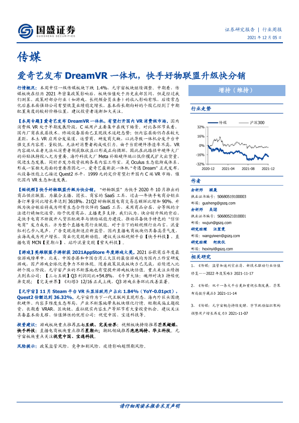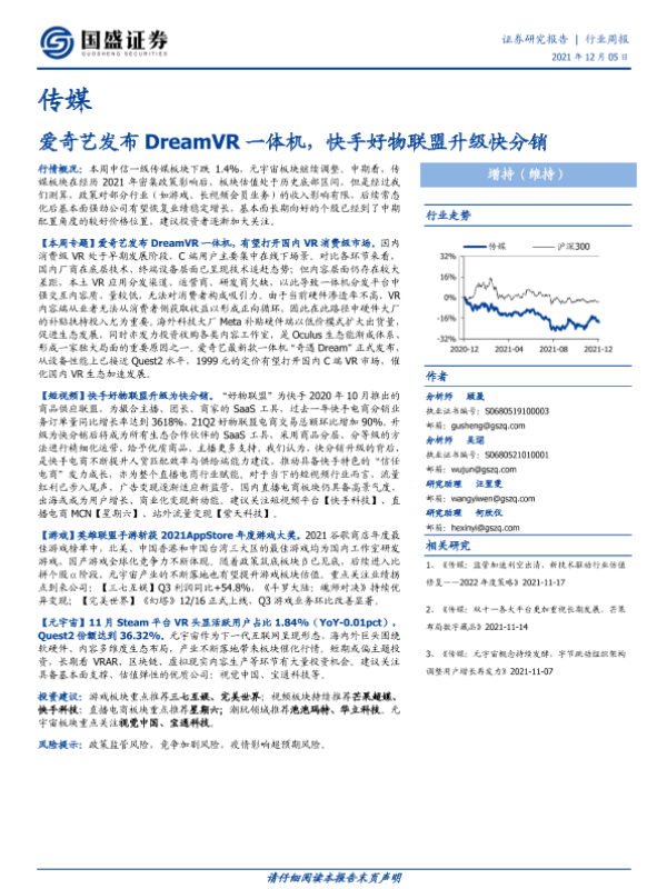【国盛证券】【20211205】传媒行业周报:爱奇艺发布DreamVR一体机,快手好物联盟升级快分销-17页