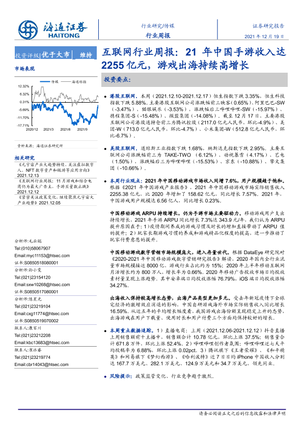 【海通证券】【20211219】20211219-海通证券-互联网行业周报:21年中国手游收入达2255亿元,游戏出海持续高增长-9页