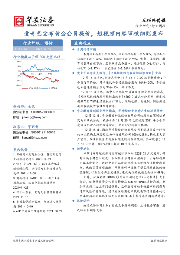 【华安证券】【20211219】20211219-华安证券-互联网传媒行业周报:爱奇艺宣布黄金会员提价,短视频内容审核细则发布-17页