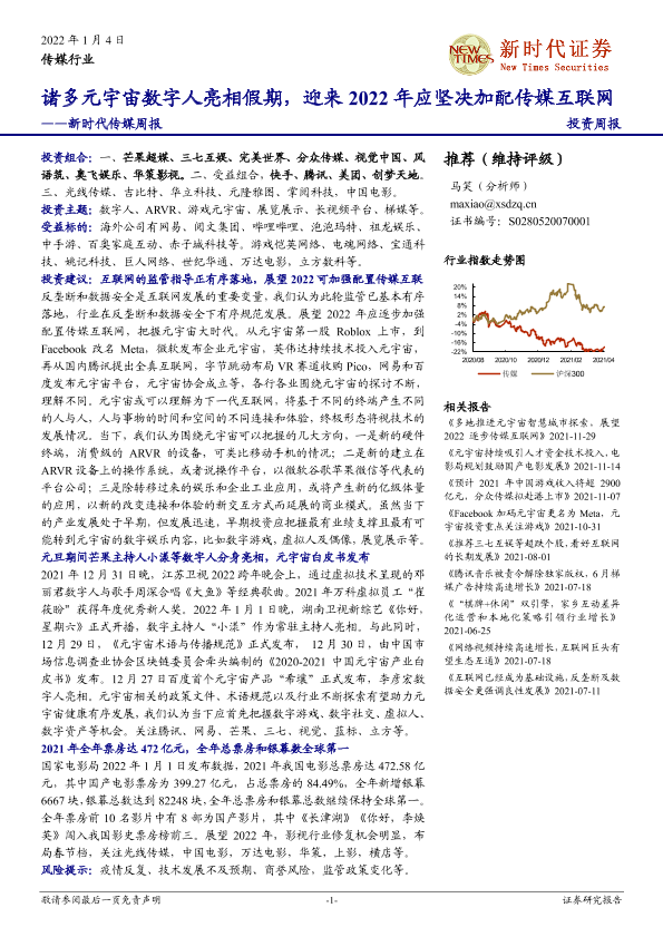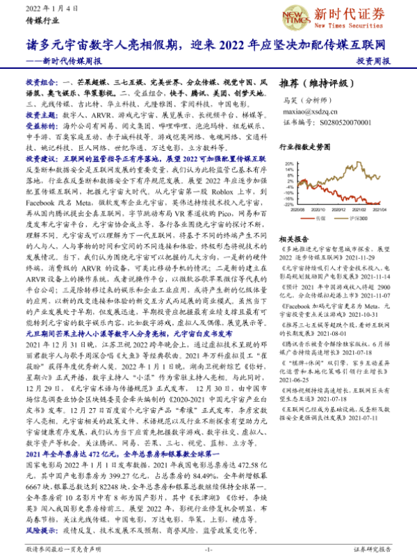【新时代证券】【20220104】新时代传媒周报:诸多元宇宙数字人亮相假期,迎来2022年应坚决加配传媒互联网-32页