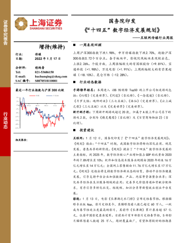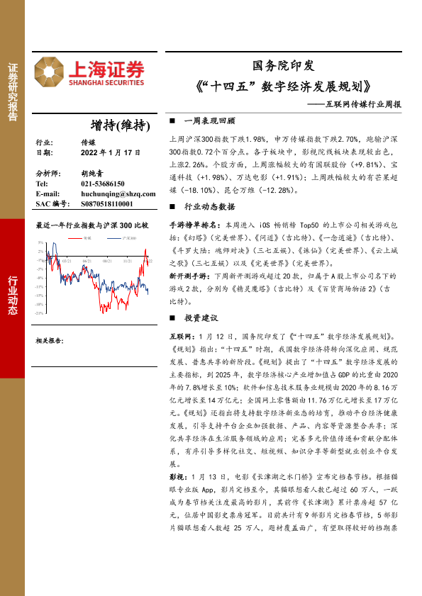 【上海证券】【20220117】互联网传媒行业周报:国务院印发《“十四五”数字经济发展规划》-9页