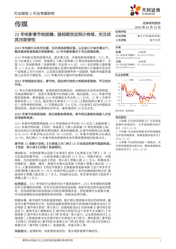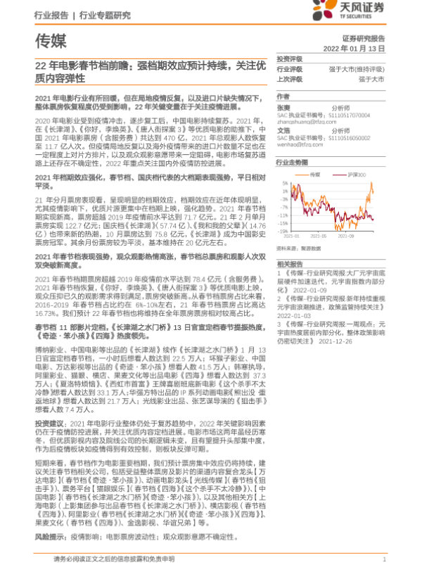 【天风证券】【20220113】22年电影春节档前瞻:强档期效应预计持续,关注优质内容弹性-8页