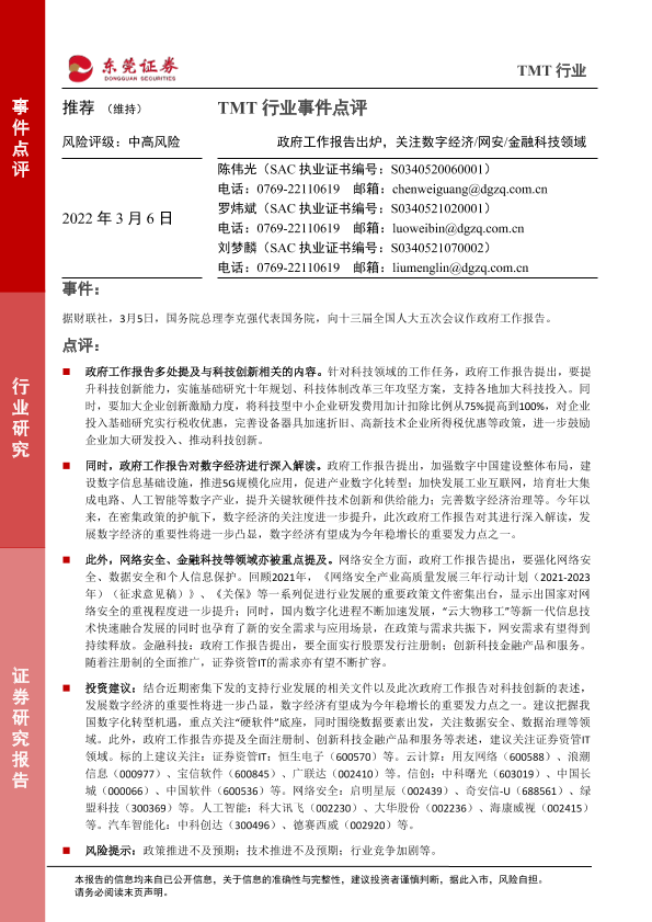 【东莞证券】【20220306】TMT行业事件点评:政府工作报告出炉,关注数字经济 网安 金融科技领域-2页