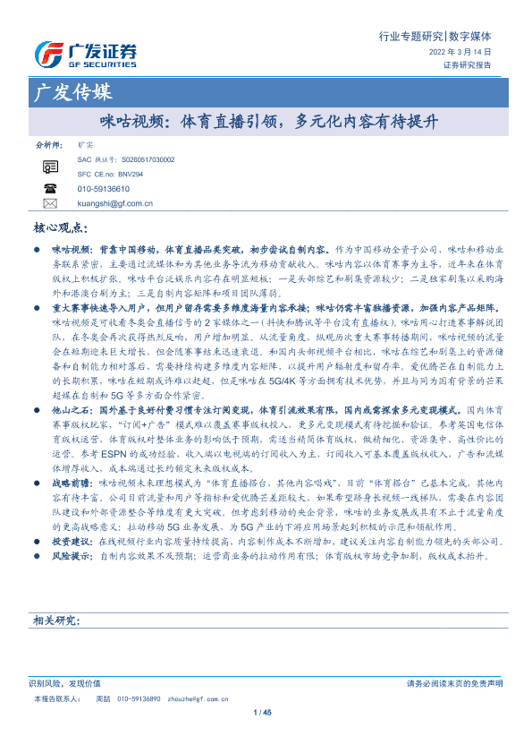 【广发证券】【20220314】广发传媒行业专题研究:咪咕视频:体育直播引领,多元化内容有待提升-45页