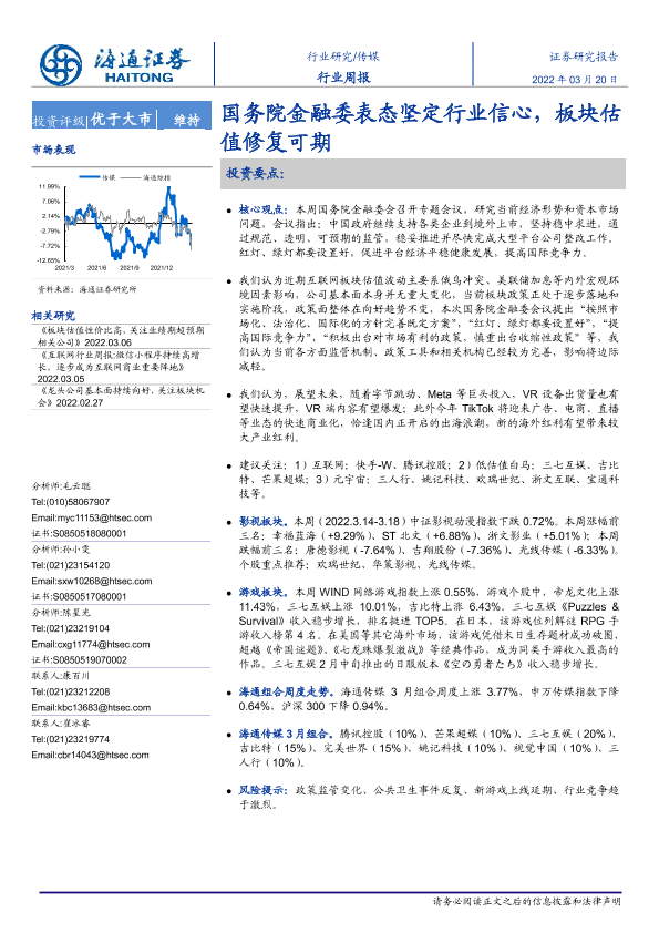 【海通证券】【20220320】20220320-海通证券-传媒行业周报:国务院金融委表态坚定行业信心,板块估值修复可期-10页