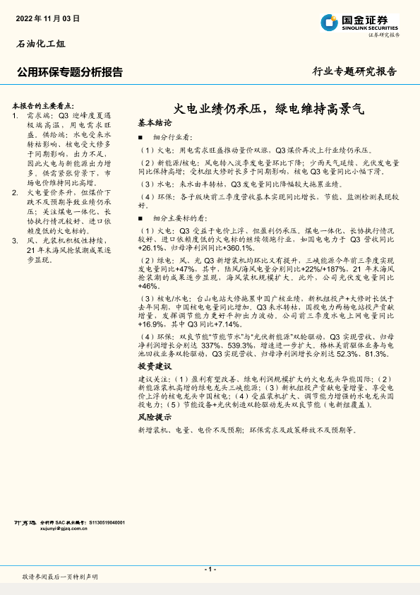 【国金证券】【20221103】公用环保行业专题分析报告:火电业绩仍承压,绿电维持高景气-20页