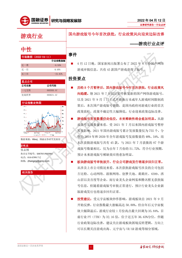 【国融证券】【20220412】游戏行业点评:国内游戏版号今年首次获批,行业政策风向迎来边际改善-3页