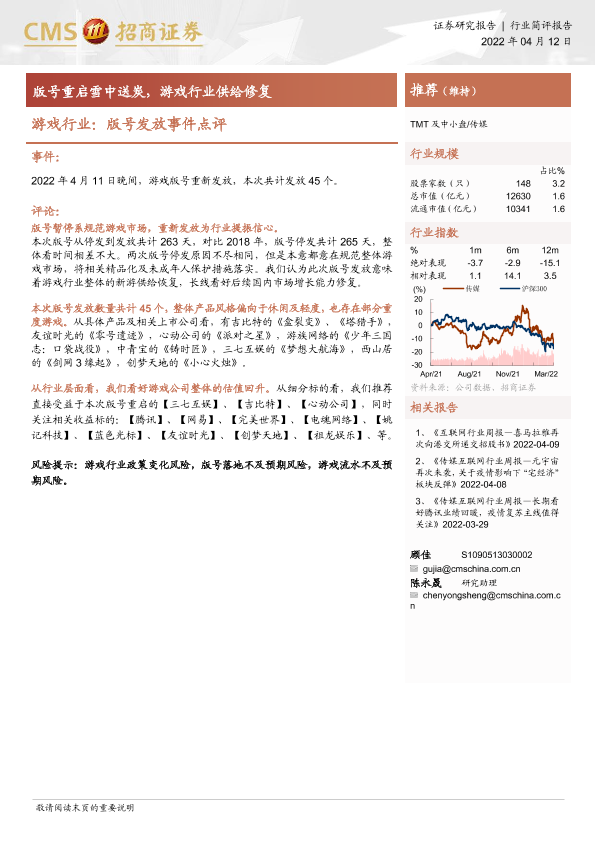 【海通证券】【20220412】游戏行业:版号发放事件点评-版号重启雪中送炭,游戏行业供给修复-2页
