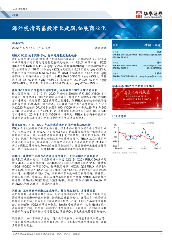【华泰证券】【20220517】传媒行业动态点评:海外疫情高基数增长疲弱,拓展商业化-9页
