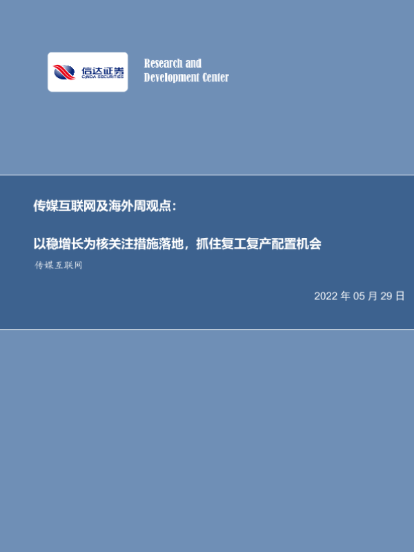 【信达证券】【20220529】20220529-信达证券-传媒互联网及海外周观点:以稳增长为核关注措施落地,抓住复工复产配置机会-15页