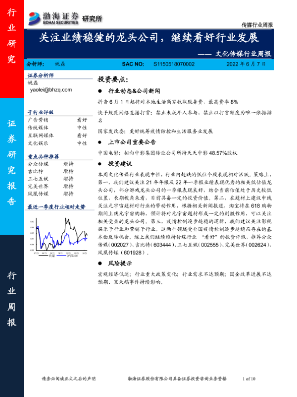 【渤海证券】【20220607】20220607-渤海证券-文化传媒行业周报:关注业绩稳健的龙头公司,继续看好行业发展-10页