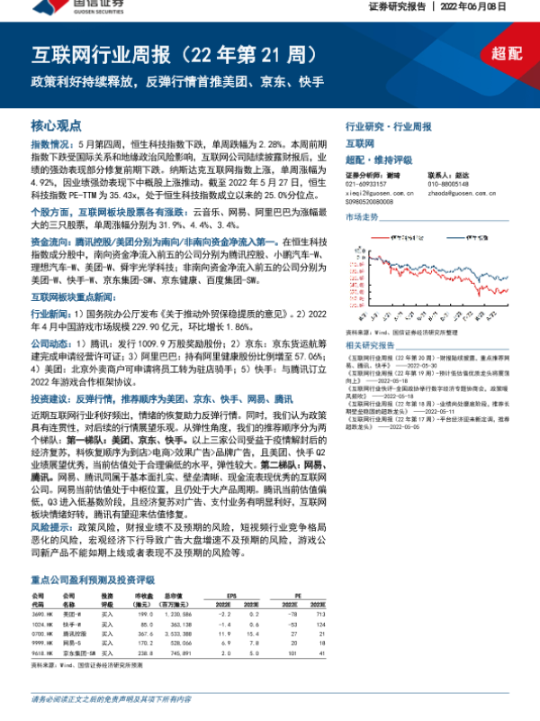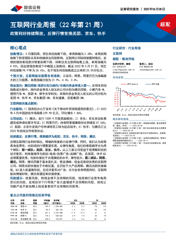 【国信证券】【20220608】20220608-国信证券-互联网行业周报(22年第21周):政策利好持续释放,反弹行情首推美团、京东、快手-13页