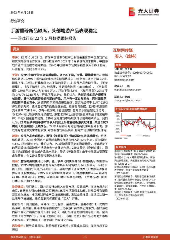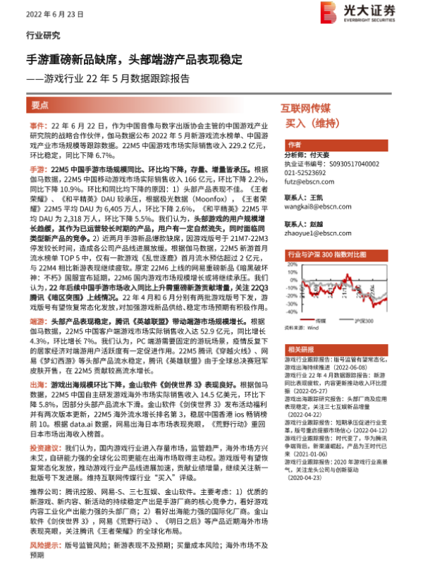 【光大证券】【20220623】游戏行业22年5月数据跟踪报告:手游重磅新品缺席,头部端游产品表现稳定-2页