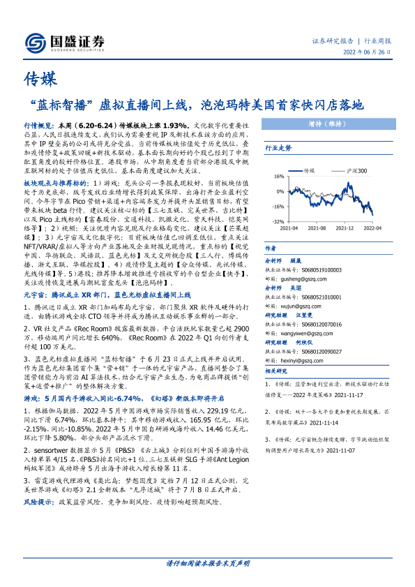 【国盛证券】【20220626】20220626-国盛证券-传媒行业周报:“蓝标智播”虚拟直播间上线,泡泡玛特美国首家快闪店落地-13页
