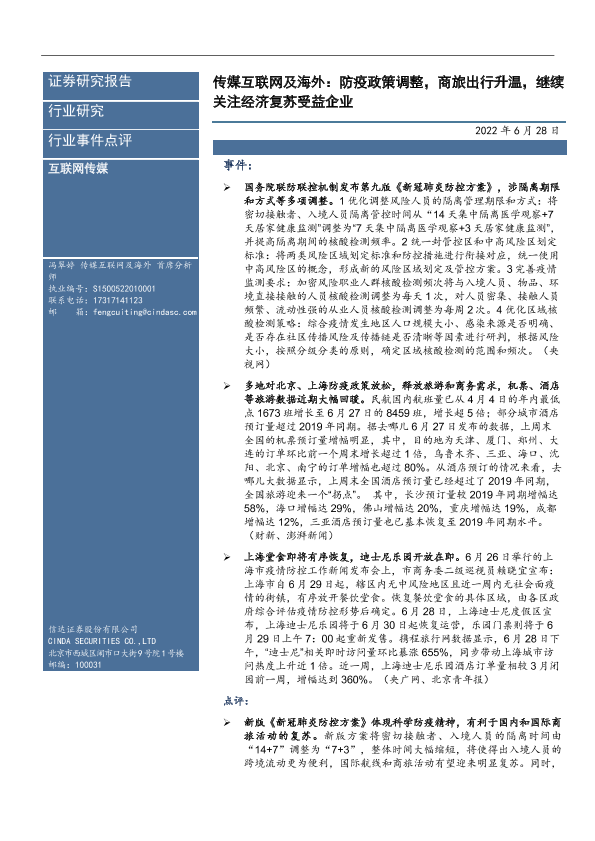 【信达证券】【20220628】传媒互联网及海外:防疫政策调整,商旅出行升温,继续关注经济复苏受益企业-5页