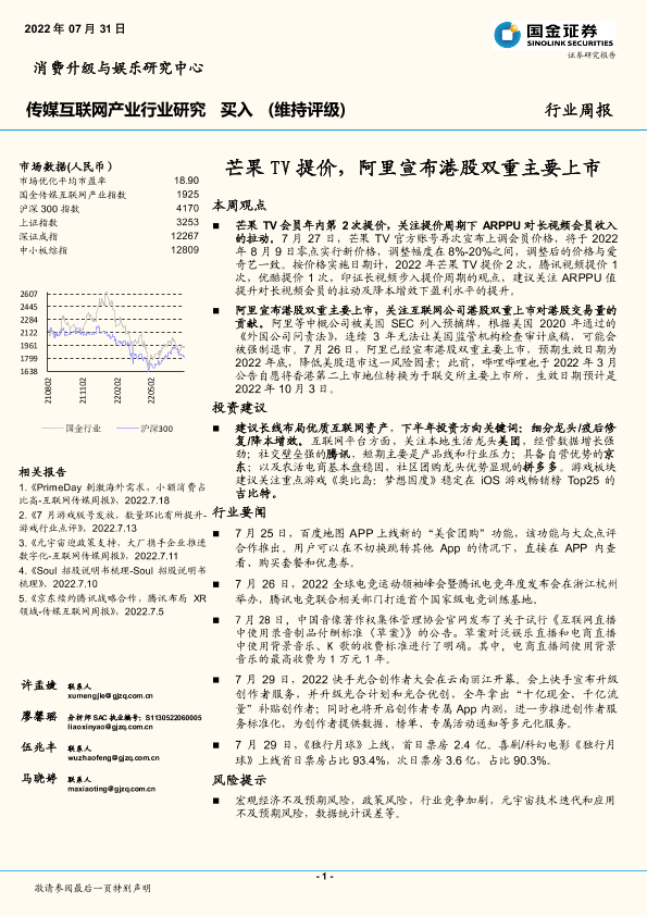 【国金证券】【20220731】传媒互联网产业行业研究周报:芒果TV提价,阿里宣布港股双重主要上市-18页