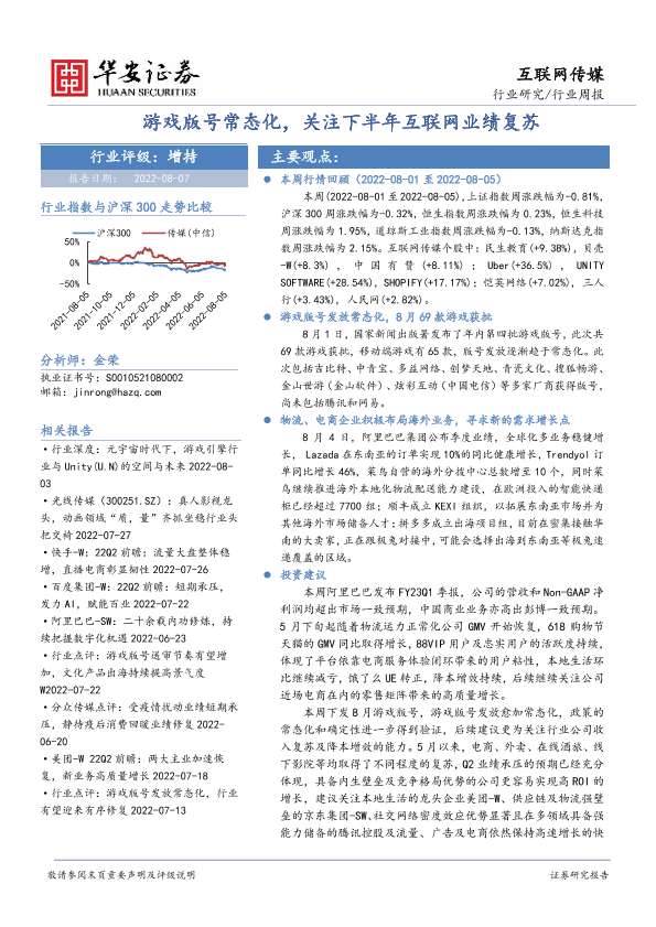 【华安证券】【20220807】互联网传媒行业周报:游戏版号常态化,关注下半年互联网业绩复苏-22页